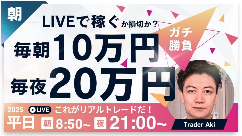毎朝10万円稼げるかしばらく挑戦!10万円プラスかマイナスになるレベルのロットで挑戦しますが10:30までに達成できない場合はごめんなさい!リハビリ中です。トレーダーAkiのライブトレード配信。スキャ&デイトレ 平日平常時は8時50分頃~仲値頃まで、16:50時頃から1時間半、22:00頃~3時間、相場分析をしながらトレードします。チャット欄では自由に交流してください。